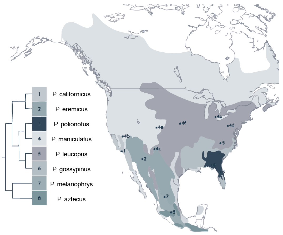 (Top left) The forest-dwelling deer mouse, P. maniculatus nubiterrae (Top right) The beach mouse, P. polionotus phasma (Bottom left) The oldfield mouse, P. polionotus sumneri (Bottom Right) The cotton mouse, P. gossypinus