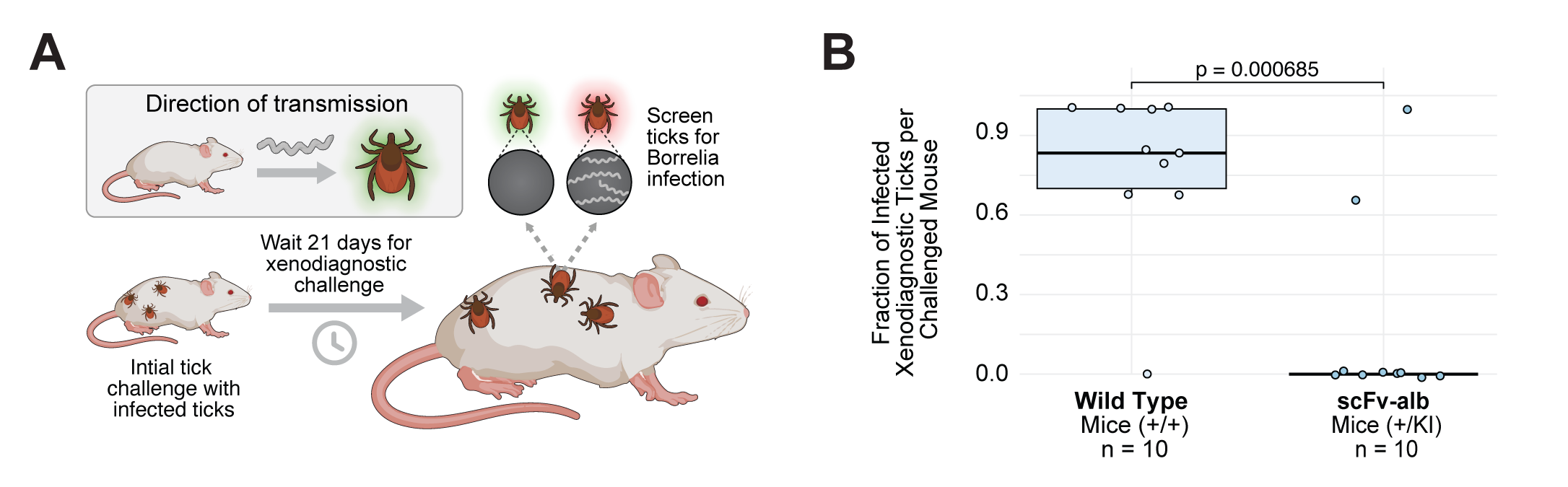 Engineered mice produce protective antibodies that stop Lyme-causing bacteria from infecting ticks, helping break the cycle of transmission to people and wildlife.